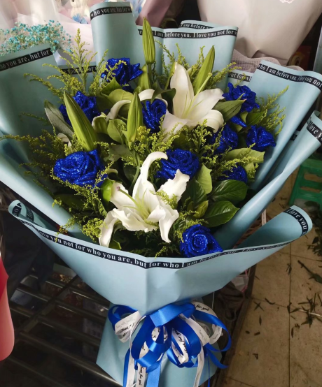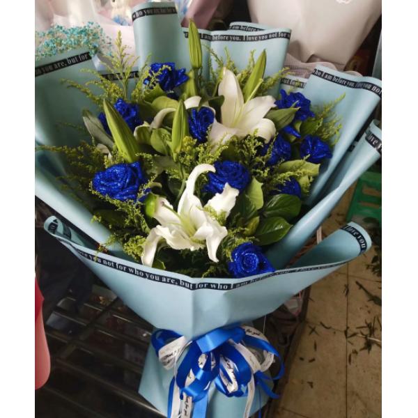 材质: 11枝蓝色妖姬,6朵白百合,黄英绿叶搭配