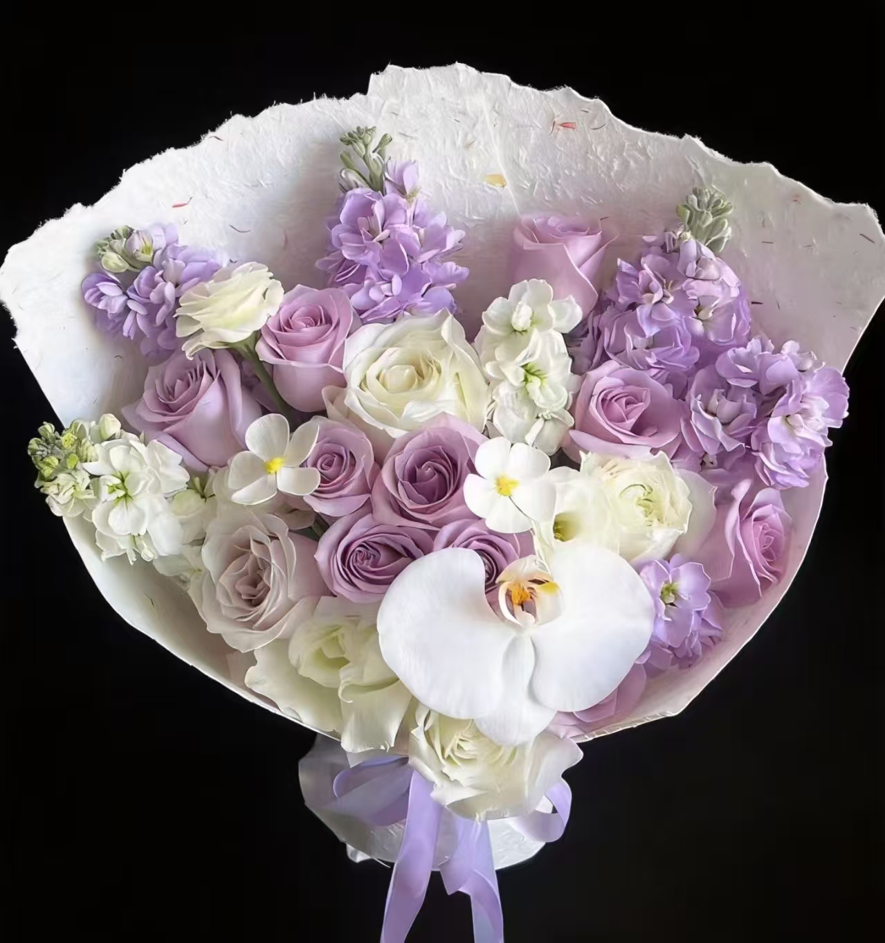 精选11枝紫玫瑰,4枝白玫瑰,4枝紫色紫罗兰,