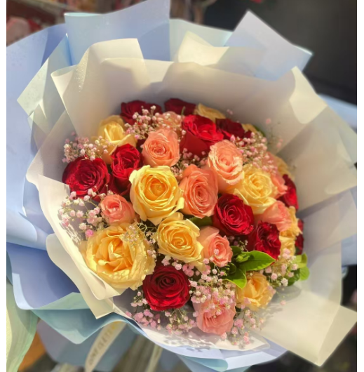 11枝红玫瑰,11枝香槟玫瑰,11枝粉玫瑰,粉色满天星,栀子叶搭配