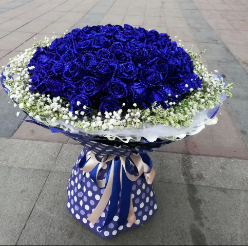 精选蓝色妖姬99枝,满天星围边搭配