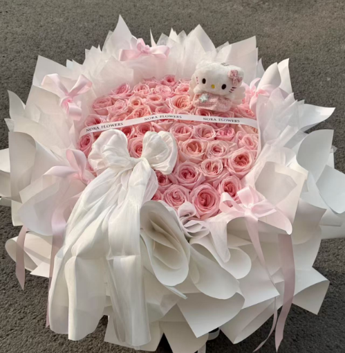 52枝粉雪山玫瑰,1只KT猫 丝带如图制作
