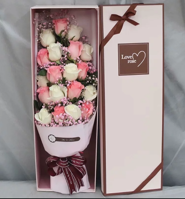 精选9枝戴安娜粉玫瑰+10枝白玫瑰,共19枝。