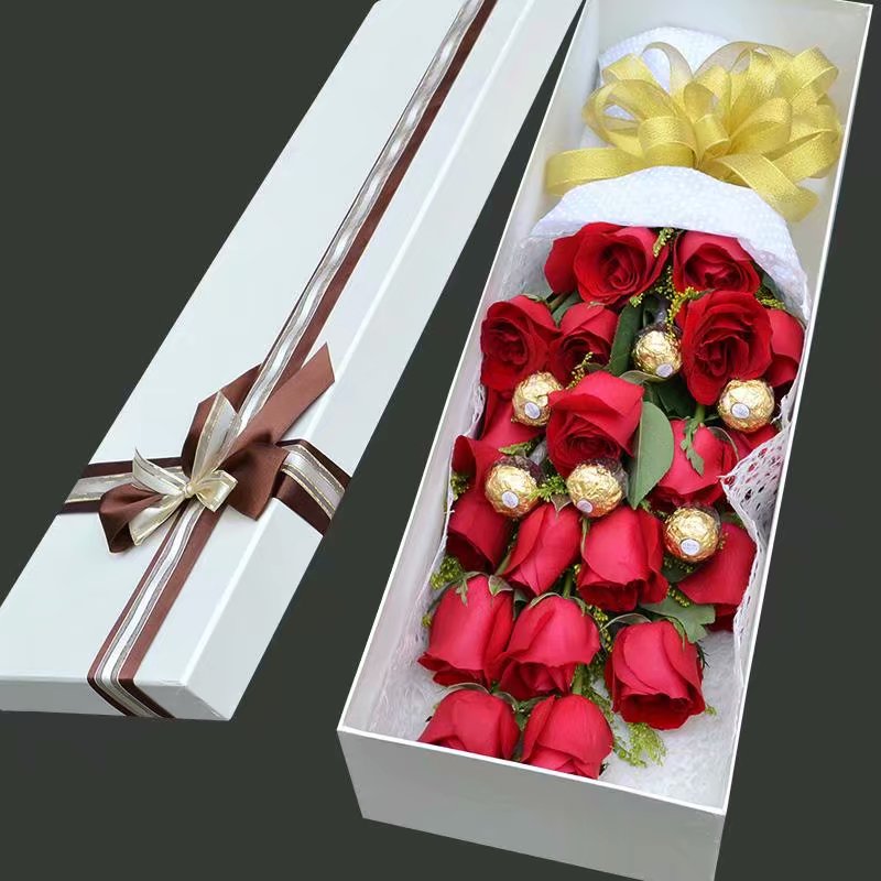 精选19枝红玫瑰,6颗巧克力,黄英搭配