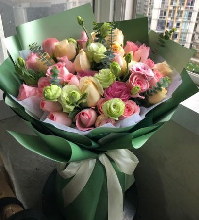 33枝戴安娜和香槟玫瑰混搭,尤加利叶,绿色和粉色洋桔梗搭配