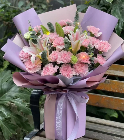 19枝粉色康乃馨,6朵粉色百合,彩灯,绿色洋桔梗,尤加利叶丰满
