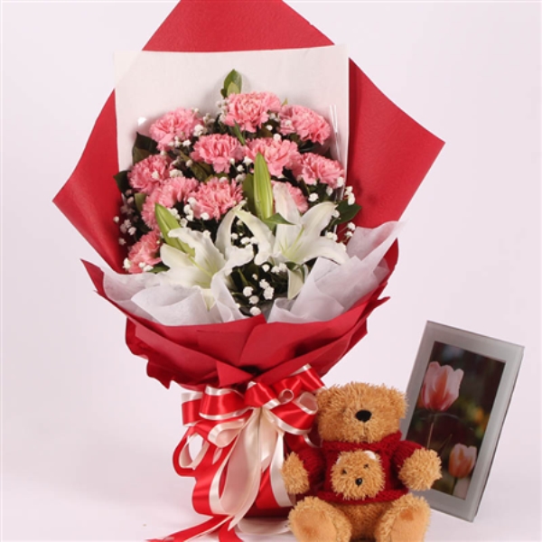 11枝粉色康乃馨,2枝多头百合,小熊一只,满天星、黄英间插。