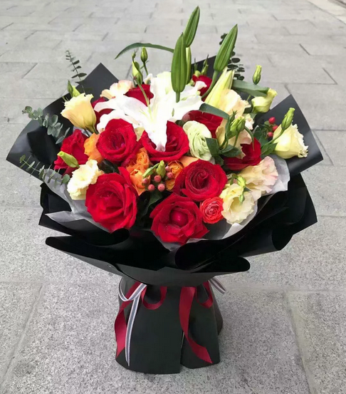 11枝玫瑰,3枝多头百合,3枝洋桔梗,尤加利叶、相思红豆搭配