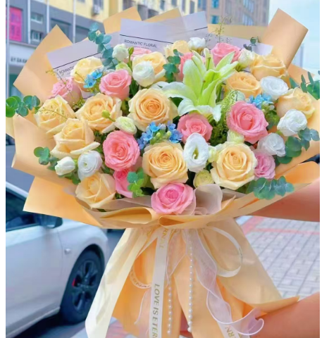 精选14朵戴安娜玫瑰,15朵香槟玫瑰,1枝多头百合,