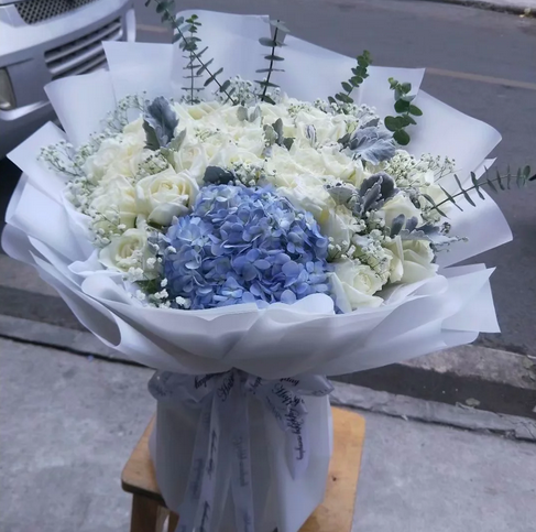 33朵白玫瑰,一支蓝色绣球,尤加利叶,满天星,银叶菊搭配