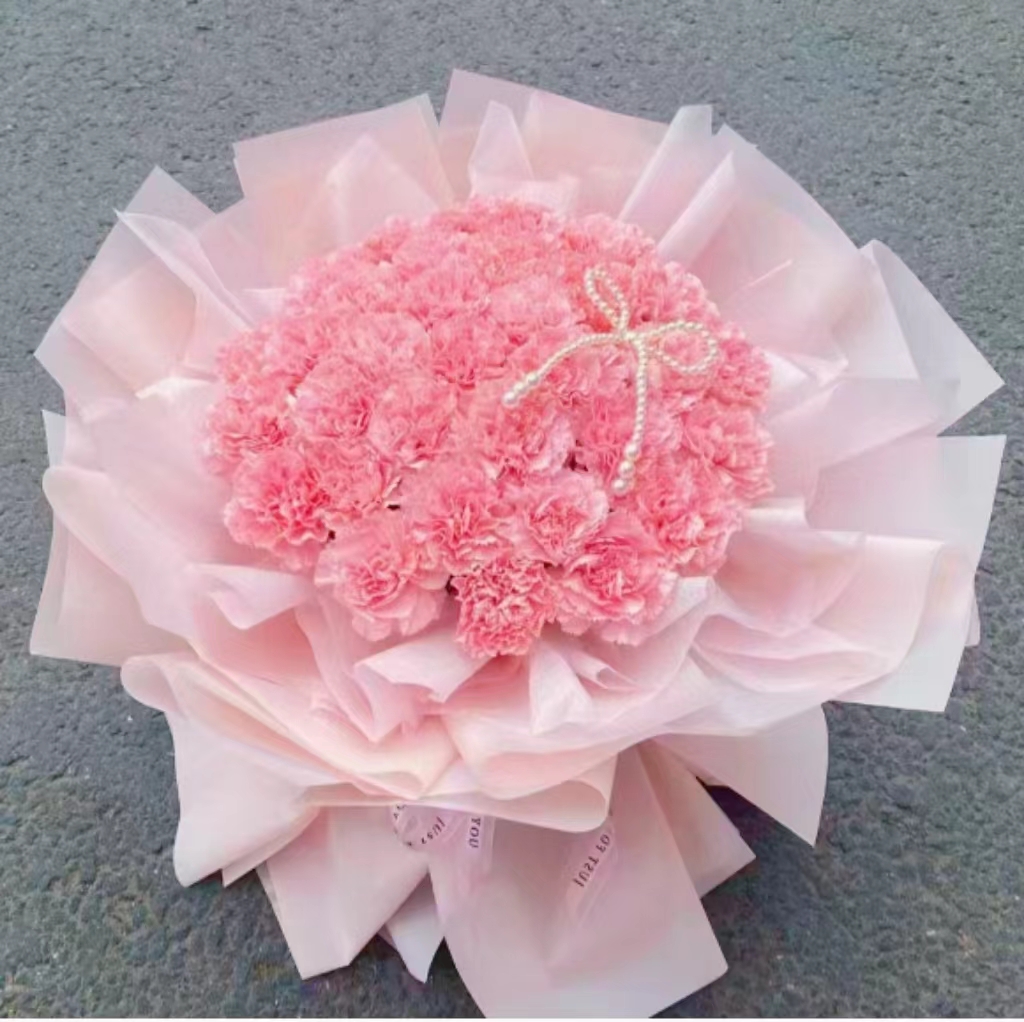 精选33朵粉色康乃馨,珍珠蝴蝶结