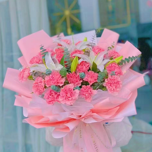 (彩灯)精选21朵粉色康乃馨,2枝多头百合,尤加利叶搭配