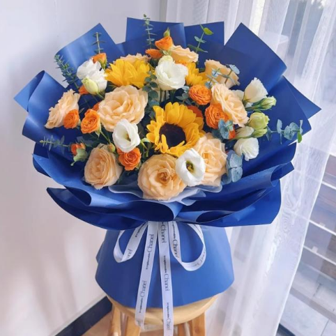 精选3枝向日葵,9枝香槟玫瑰,4枝多头橙色泡泡,