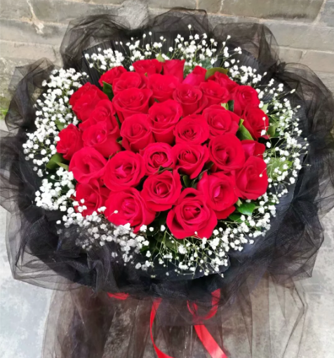 精选33枝红玫瑰,满天星围边