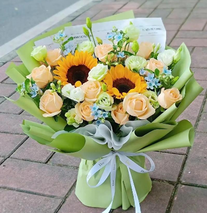 精选11朵香槟玫瑰,2朵向日葵,桔梗丰满,蓝星花搭配