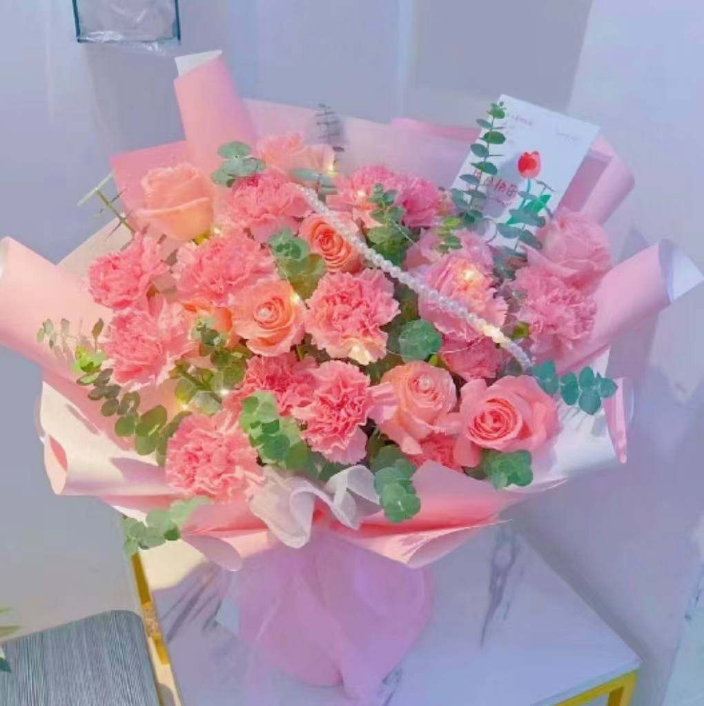 (彩灯+珍珠串)精选13枝粉色康乃馨,8枝戴安娜玫瑰,