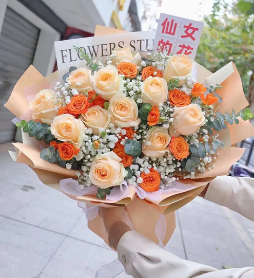 19支香槟玫瑰,4枝多头橙色泡泡,满天星丰满,尤加利叶搭配