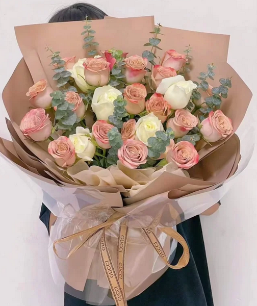 21枝卡布奇诺,5枝白玫瑰,尤加利叶搭配