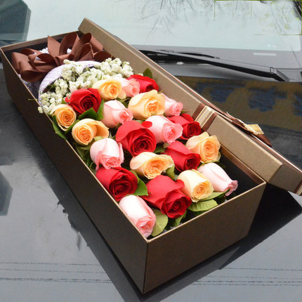 精心挑选7朵粉玫瑰,7朵香槟玫瑰,7朵红玫瑰 共21朵玫瑰 点缀满天星 绿叶