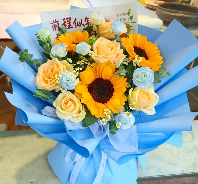 3枝向日葵,5朵香槟玫瑰,尤加利叶,小雏菊,桔梗喷蓝色搭配