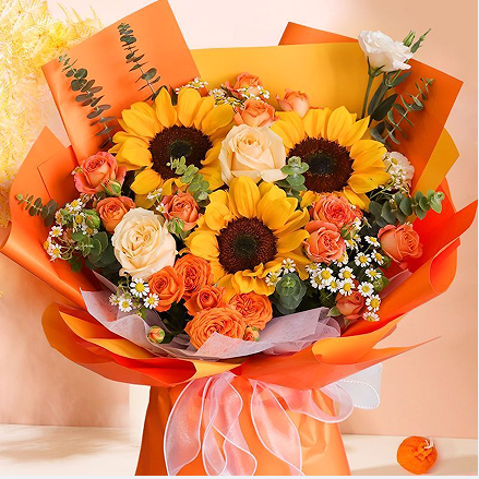 3枝向日葵,2枝香槟玫瑰,5枝多头橙色泡泡,桔梗,尤加利叶,小雏菊搭配