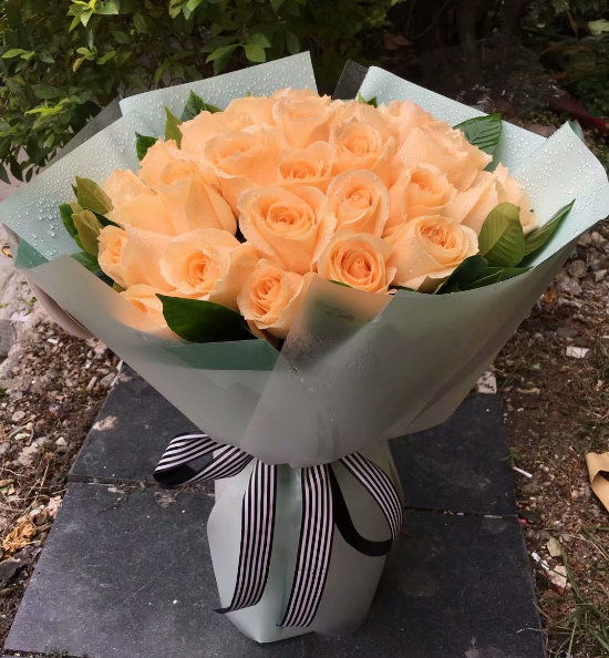 33朵香槟玫瑰,绿叶搭配。