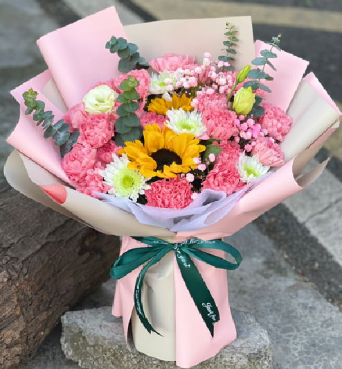 19枝粉色康乃馨,2枝向日葵,粉色满天星,尤加利叶,小雏菊,洋桔梗丰满