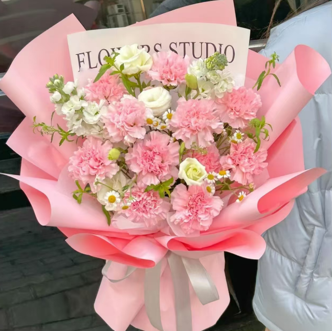 11朵粉色康乃馨,2枝白色紫罗兰,桔梗 洋甘菊,绿叶搭配