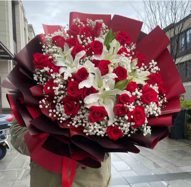 33枝红玫瑰,10朵百百合,满天星丰满搭配。