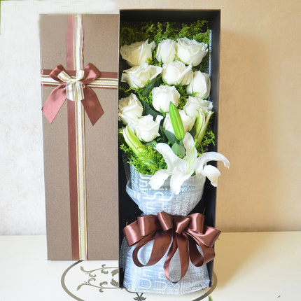 11枝白玫瑰加2枝百合,黄英搭配