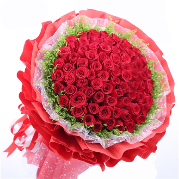 66枝昆明顶级红玫瑰,黄莺间插