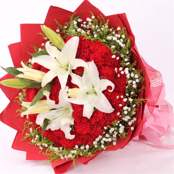 精心挑选66朵康乃馨,8朵百合,点缀黄莺、满天星,美丽迷人