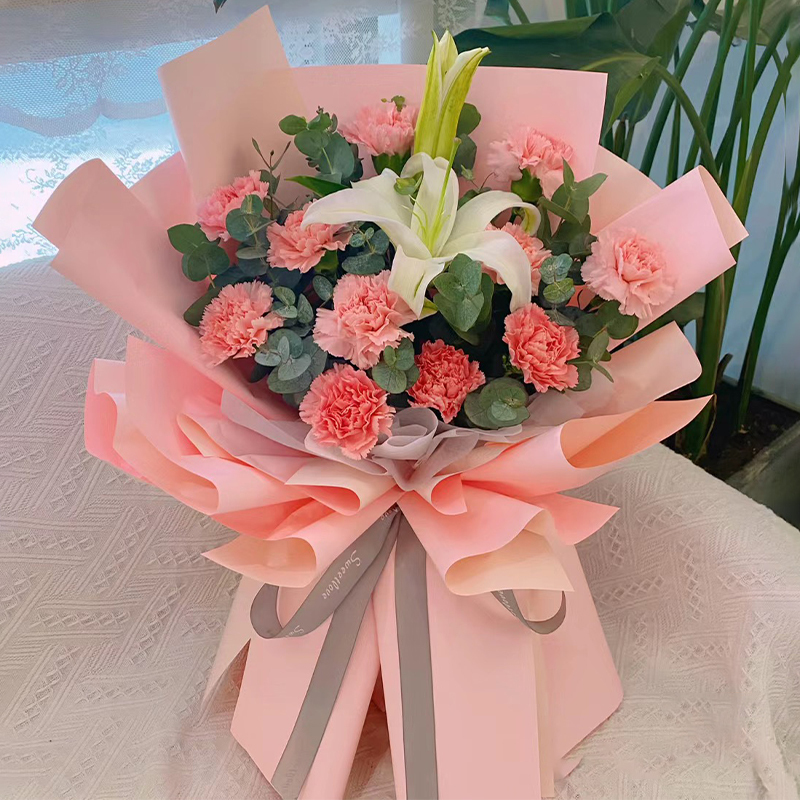 1枝百合,11枝粉色康乃馨,尤加利叶搭配