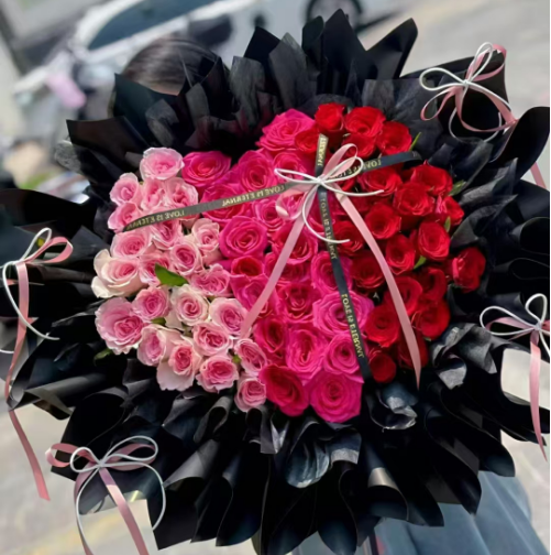 精选22朵红玫瑰,22朵洛神玫瑰,22朵弗洛伊德玫瑰,丝带如图制作心形
