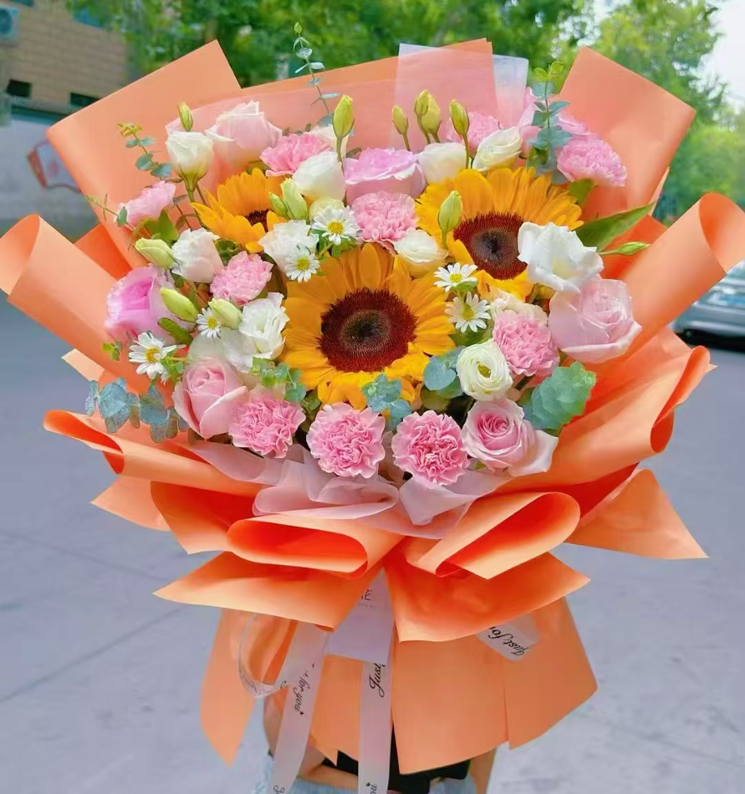 精选9枝戴安娜玫瑰,10枝粉色康乃馨,3枝向日葵 桔梗丰满,小菊,尤加利叶搭配