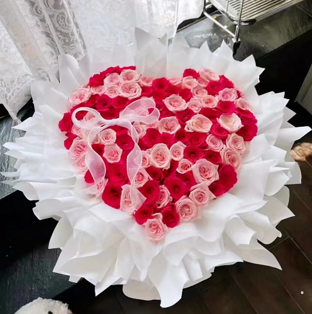 精选99枝精品红玫瑰+粉荔枝 丝带 如图制作心形